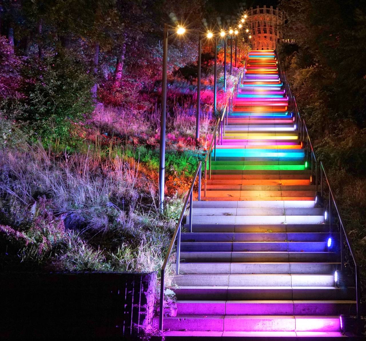 Tausende kleine und große Scheinwerfer, LED-Leuchten und Strahler blinzeln, blinken und glitzern zwischen den Bäumen und Skulpturen im Sauerlandpark. Sie verwandeln Himmelstreppe, Turm und Jüberg in einen magischen Ort. Farben fluten Wege und Äste, Pflanzen und Bäume. Augen wachsen aus dem Boden, Frauenbeine aus der Wand. Würfel tanzen Walzer und ein meterhohes Winkemännchen lockt die Besucher mit glühenden Armen. Lichtkünstler Reinhard Hartleif sprudelt vor Ideen. Manche der leuchtenden Kunstwerke entstanden bei ihm sogar im Traum - mitten in der Nacht auf einem Block aufgezeichnet und mit dem Team umgesetzt.