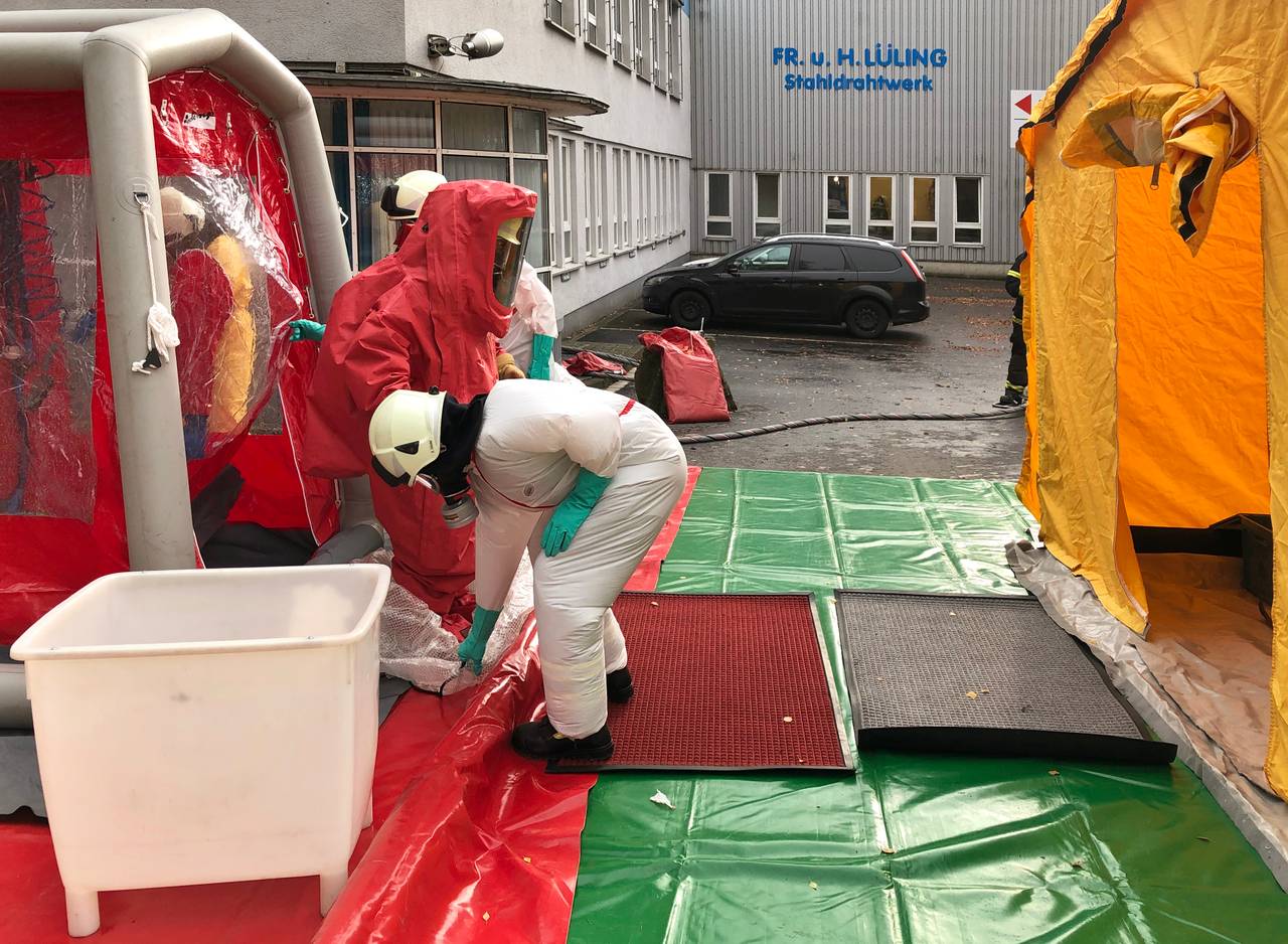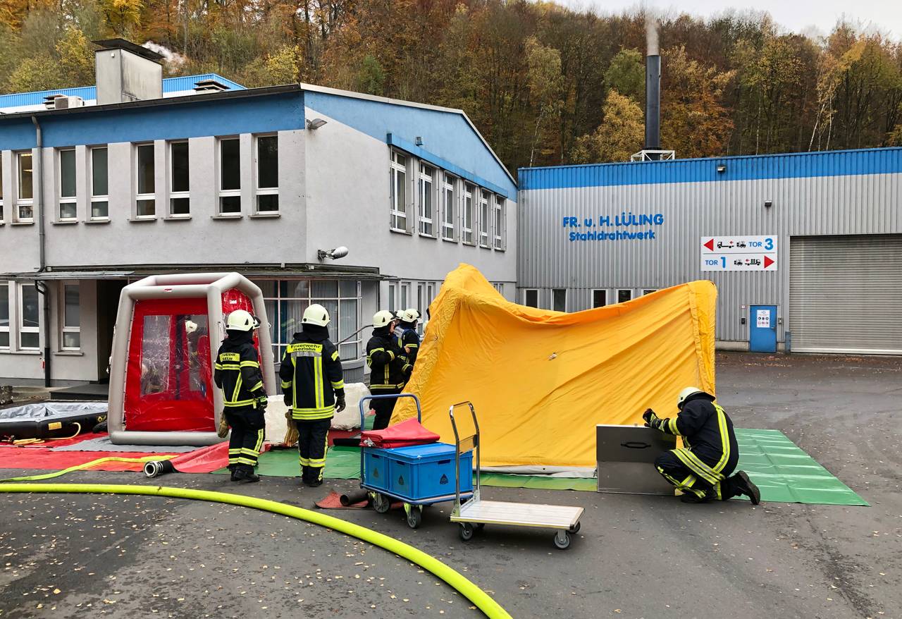 An einem Stahldrahtwerk sind am Mittag bei einer Filterreinigung Salzsäuredämpfe ausgetreten. 18 Personen wurden leicht verletzt - sie klagten über Atemwegsreizungen und kamen ins Krankenhaus. Die Feuerwehr hat das Gebäude gelüftet und mit Chemikalien-Schutz-Anzügen und Atemschutz nach der Chemikalie gesucht, die den Einsatz ausgelöst hat. Ein genaues Ergebnis der Untersuchungen steht noch aus - das Arbeitsschutzamt ermittelt. Der Behälter in dem die chemische Reaktion stattgefunden hat, konnte aber abgedichtet werden.