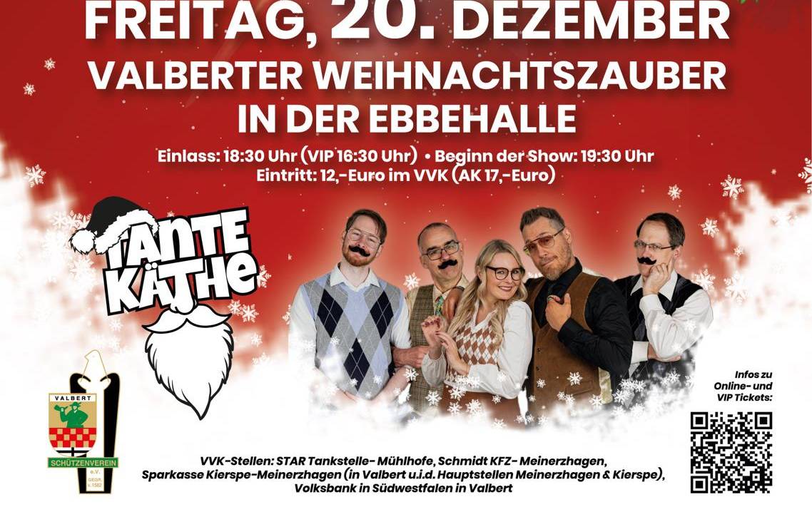 Der Schützenverein in Meinerzhagen-Valbert lädt zur After-Work Lamettaparty ein. Dazu gibt es Livemusik der Band "Tante Käthe". Der Einlass in der Ebbehalle beginnt um 18.30Uhr. Tickets gibt es unter anderem an der STAR Tankstelle Mühlhofe oder in der Sparkasse Kierspe-Meinerzhagen.