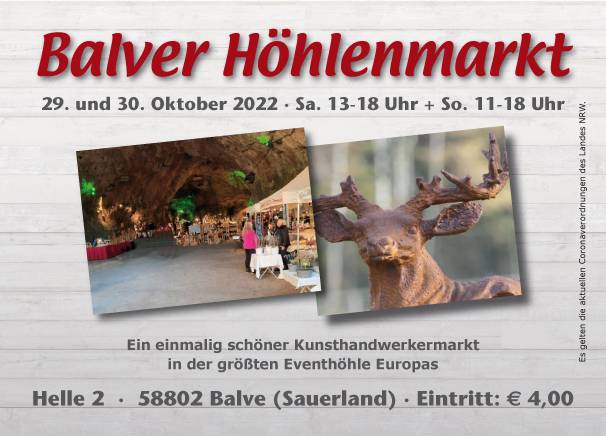 Und ich glaube ich übertreibe nicht, wenn ich sage: Die Balver Höhle ist dieses Wochenende (29. + 30.10.2022) der "Place to be" für Künstler aus dem ganzen Märkischen Kreis. Denn Samstag und Sonntag steht wieder der Balver Höhlenmarkt an! In "naturalistischem Ambiente" - damit ist die Höhle gemeint ;-) - stellen Samstag und Sonntag mehr als 40 Künstler aus ganz Deutschland Kunst und kulinarische Spezialitäten aus (soll heißen: Essen gibt's auch) - und in diesem Jahr sind auch super viele heimische Künstler am Start.