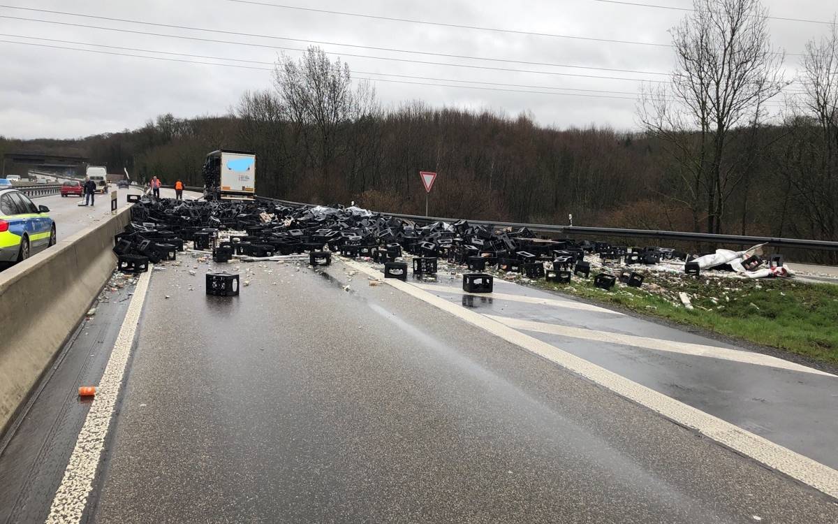 Mehr als sechs Stunden lang war die Auffahrt von der A45 zur A46 Richtung Iserlohn gesperrt. Ein LKW hatte seine Ladung verloren: etwa 800 Bier-Kästen mit Leergut. Die hatte der 33-jährige Fahrer aus Menden nach ersten Ermittlungen der Polizei offenbar nicht vernünftig gesichert. In einer Kurve kippten die Kästen um und durchtrennten die LKW-Plane. Nach einer Blutprobe wurde klar: Der Fahrer hatte Drogen genommen.Verletzt wurde niemand.