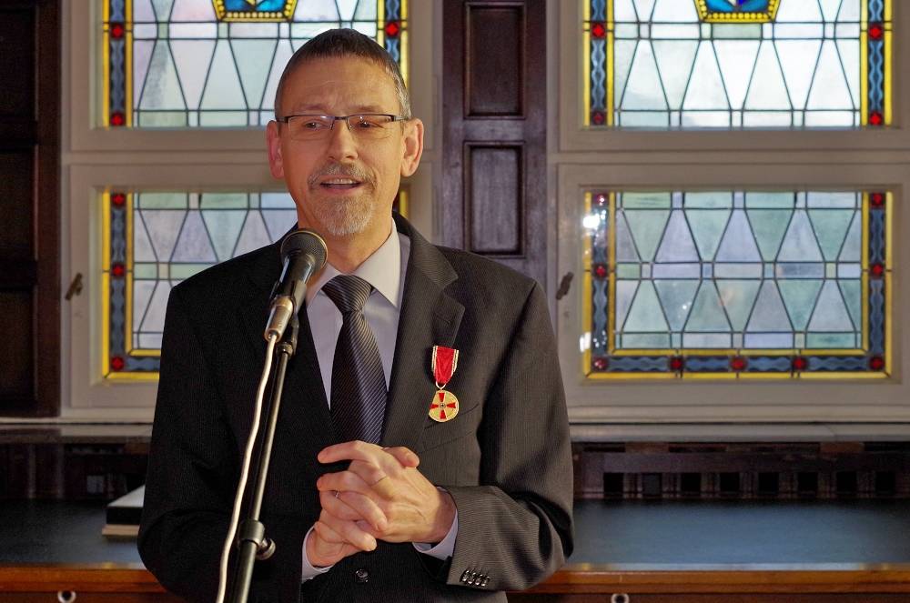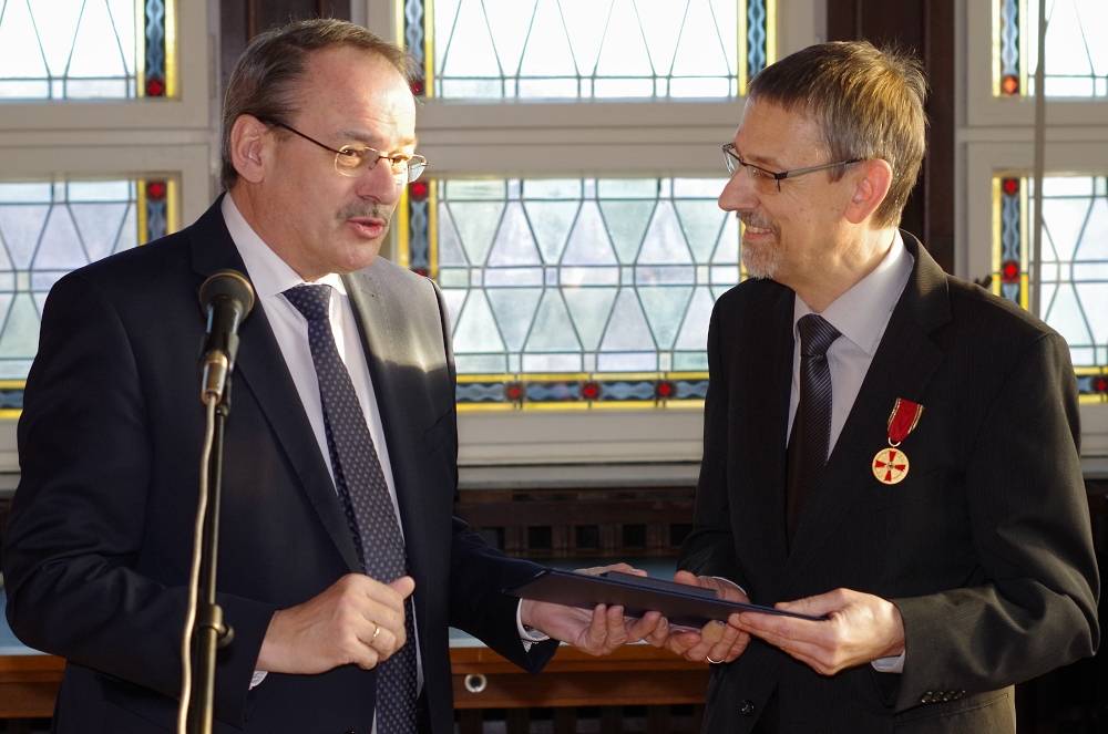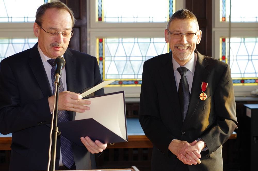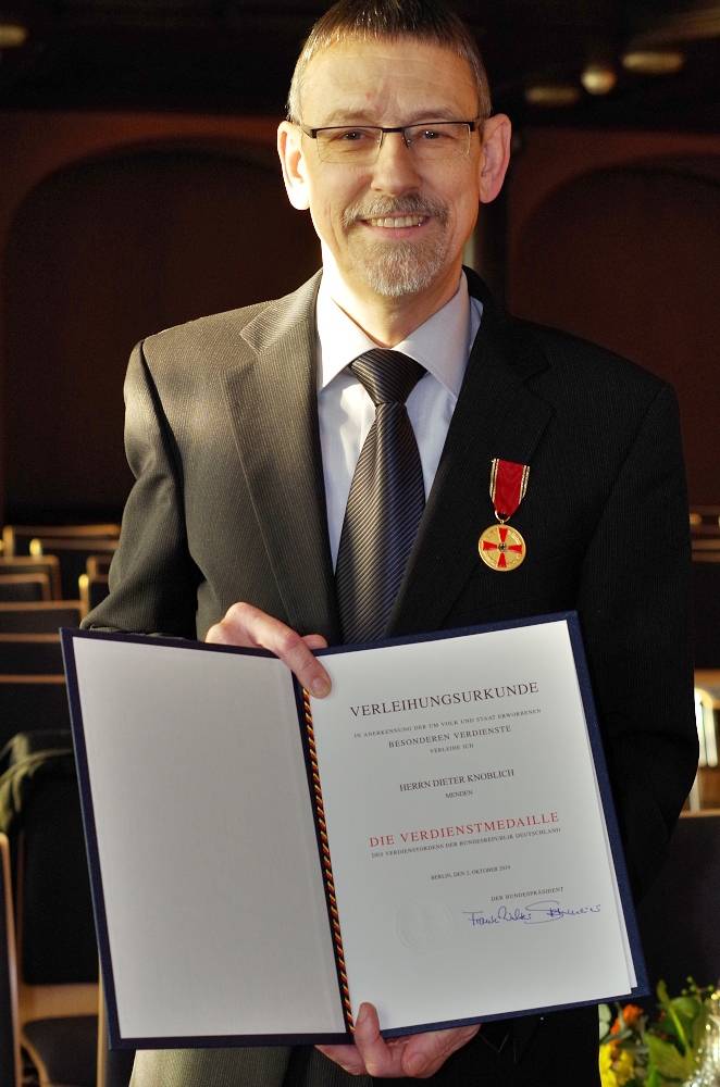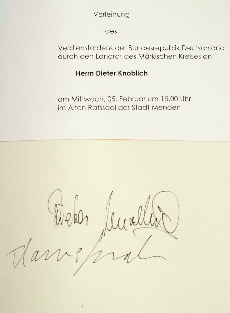 Dieter Knoblich aus Menden hat das Bundesverdienstkreuz verliehen bekommen. Landrat Thomas Gemke überreichte Knoblich den Verdienstorden der Bundesrepublik Deutschland im historischen Ratssaal der Stadt. Der Landrat vertrat damit den Bundespräsidenten. Dieter Knoblich wurde mit dem Orden für sein Lebenswerk geehrt. Er hat den Sport genutzt, um kranken Menschen zu helfen - selbstlos und ohne sich selbst zu schonen. In den letzten Jahren auch trotz eigener gesundheitlicher Probleme. Dieter Knoblich war 15 Jahre lang der Mann, der den Radio MK Lauf erst möglich gemacht hat. Ihm ist es zu verdanken, dass Spenden in ungeahnten Höhen für den guten Zweck zusammenkamen. Auch deswegen bezeichnete Mendens Bürgermeister Martin Wächter Knoblich als Vorbild für alle Bürger. In den 15 Jahren, in denen er für den Radio MK-Lauf stand, opferte er jedesmal seinen Geburtstag am 3. Oktober, um beim Radio MK-Lauf zu sein.