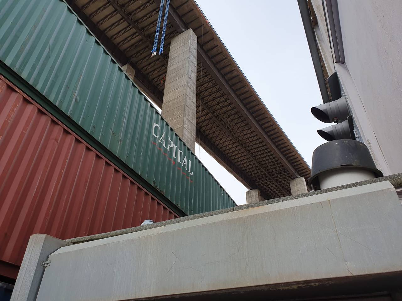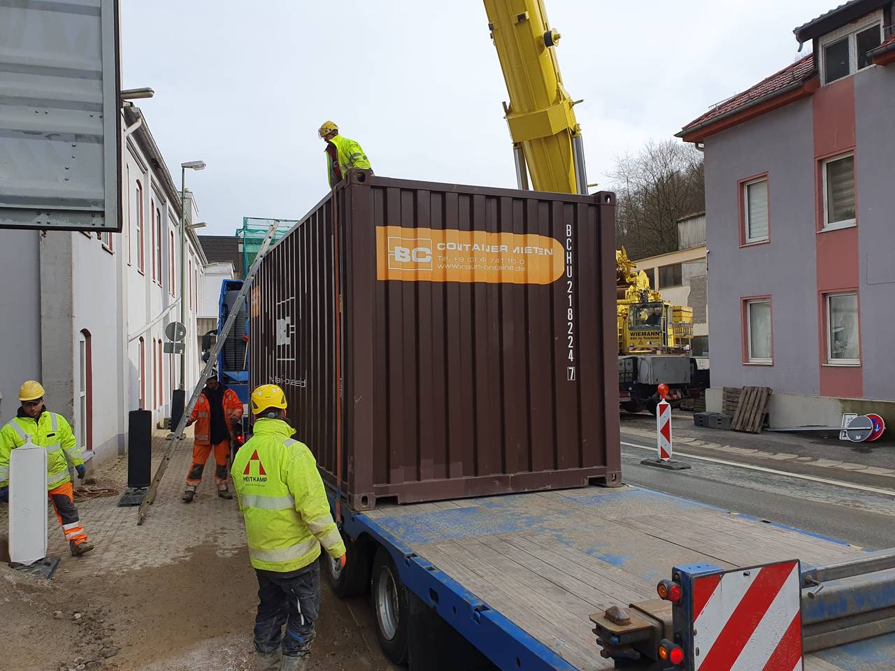 Dafür werden derzeit an der Altenaer Straße im Bereich der Brücke von einem 500-Tonnen-Mobilkran Überseecontainer über die Straße gehievt.