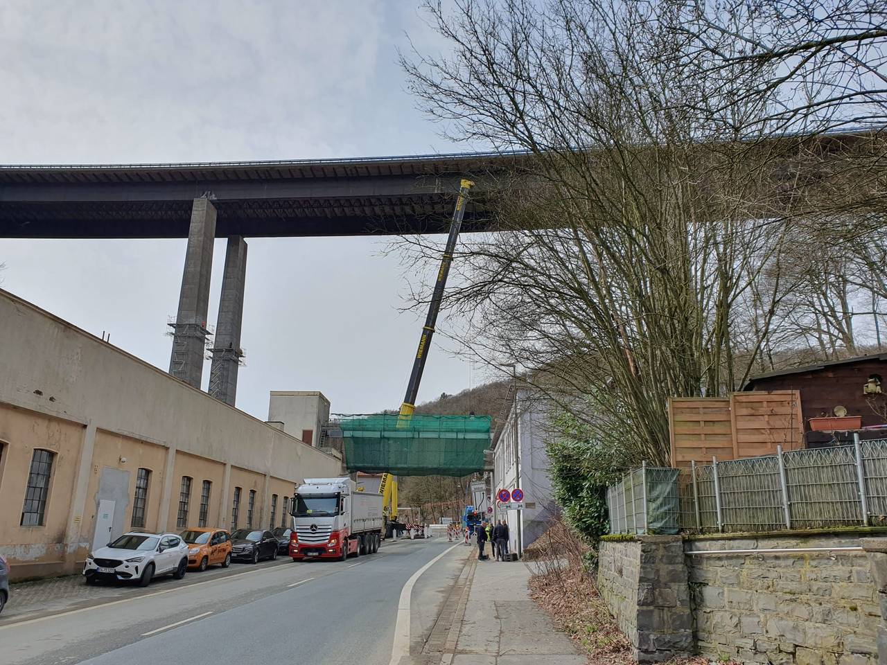 Die Container-Wand soll verhindern, dass nach der Sprengung der Talbrücke am 7. Mai Erdmassen auf das Gelände der Galvanik rutschen. Die Schutzwand soll außerdem dabei helfen, Schäden an den Gebäuden durch möglicherweise umherfliegende Trümmerteile zu verhindern. Während der Schutzwand-Errichtung wird es heute noch zu Verkehrseinschränkungen kommen: Die Fahrbahn wird in beiden Richtungen verschwenkt und schmaler, deshalb gilt Tempo 30. Eine Ampel steht immer dann auf "rot", wenn der Kran einen Container transportiert. Und auf beiden Straßenseiten gilt im Baustellenbereich ein absolutes Halteverbot.