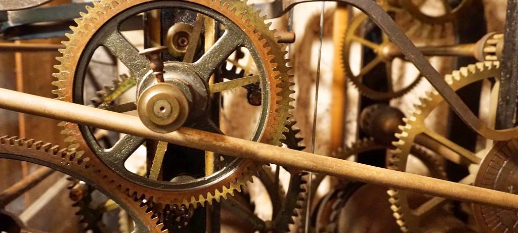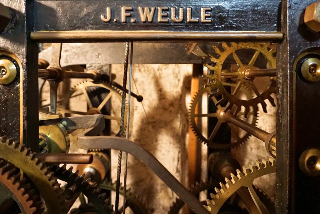 Eine Woche braucht es dann, um wieder bis zum Boden herabzusinken. Auf dem Weg dorthin treibt es den langen, hölzernen Pendel der 131 Jahre alten Kirchturmuhr an. Der ist aus Holz, weil Holz bei den schwankenden Temperaturen im hohen Kirchturm weniger arbeitet. Und seit 131 Jahren läuft diese Uhr so genau, dass die Evingser ihre eigenen Uhren danach stellen. Die Uhrenmacherei J.F. Weule in Bochenem im Harz hat sie 1888 gebaut. In Handarbeit. Ein mechanisches Meisterwerk, dass bei guter Pflege problemlos noch einmal 130 Jahre laufen kann. Da ist sich der Vorgänger von Kristian Bockermann sicher: Günter Sadowski. Er kümmert sich immer noch um die Wartung der Uhr. Geölt werden kann sie nur im Sommer und das Verstellen für Sommer- oder Winterzeit ärgert ihn jedes Mal sehr. Erstens kann so eine mechanische Uhr nicht einfach mal eben um eine Stunde zurückgestellt werden und zweitens mögen diese Uhren einfach keine Veränderung. Sie wollen einfach nur Ticken... Ticken... Ticken und Ticken...