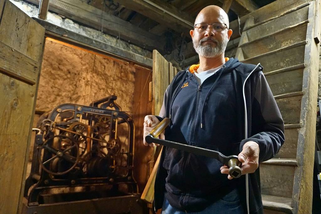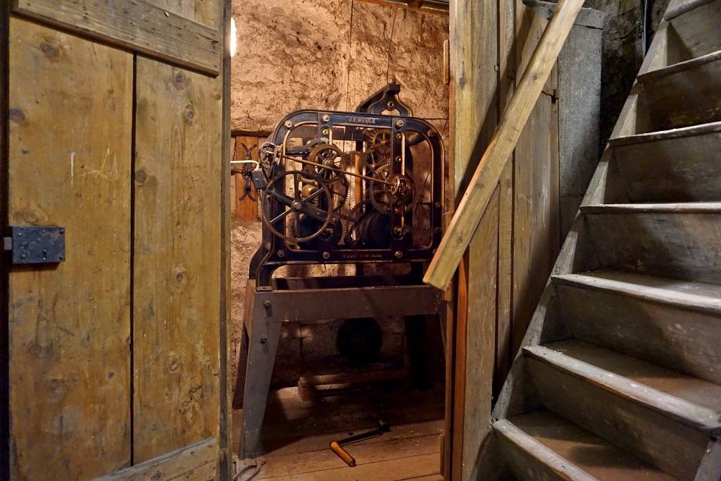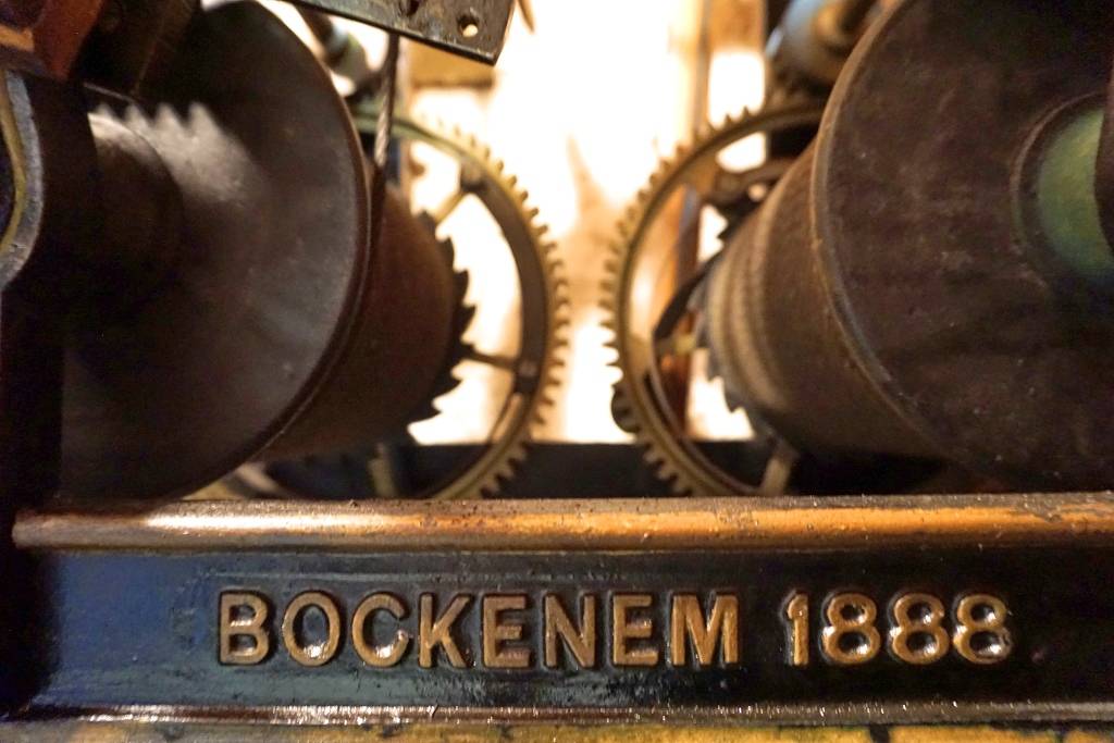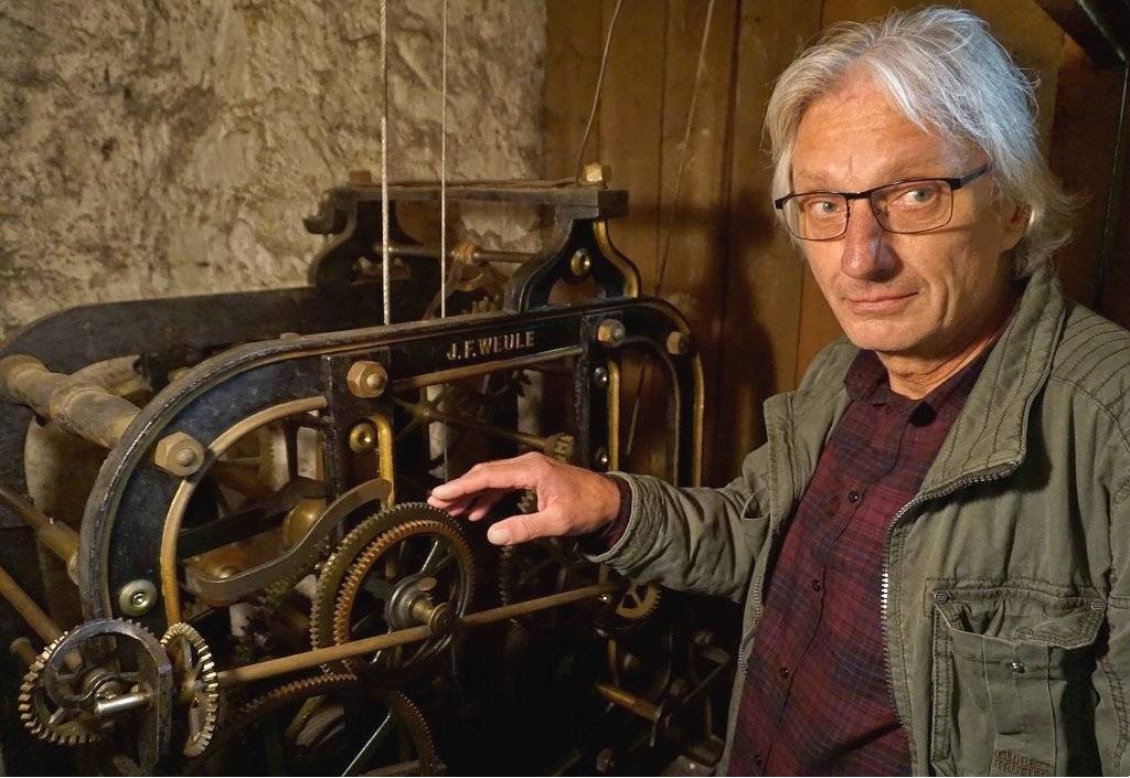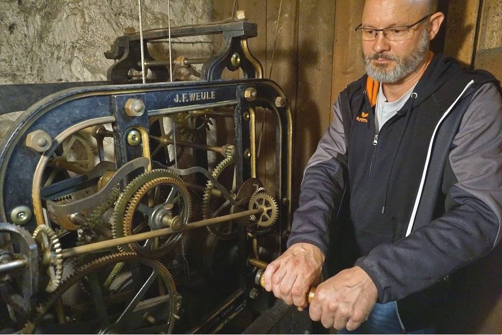… ist Kristian Bockermann. Einmal in der Woche steigt er dutzende steile Treppenstufen bis in die Spitze des Turms der evangelischen Kirche hinauf. Dort oben unter den Glocken steht ein hölzerner Schrank. Darin ist Platz für die Uhr, Kristian Bockermann und seine Kurbel. Wie der Anker eines Schiffes wird mit der Kurbel das schwere Antriebsgewicht den ganzen Weg den Kirchturm hinauf an einem Drahtseil empor gezogen.