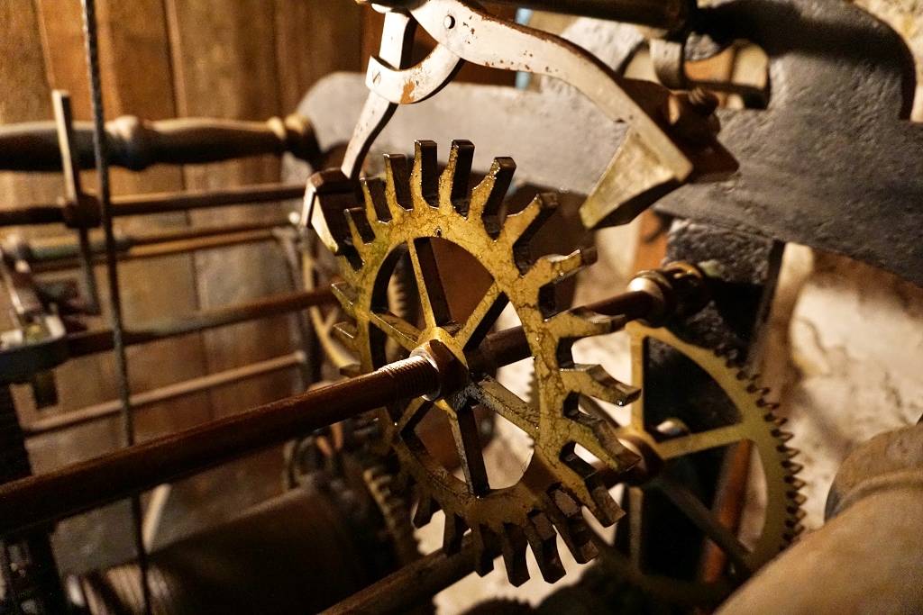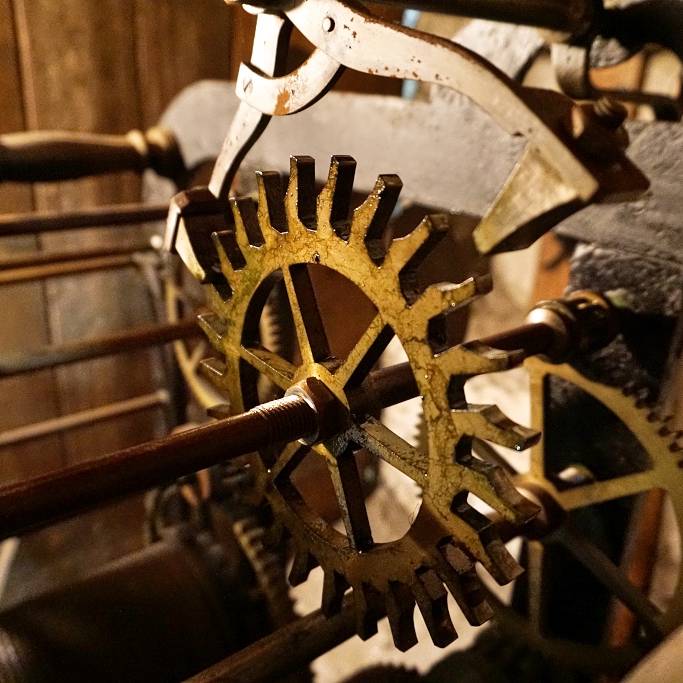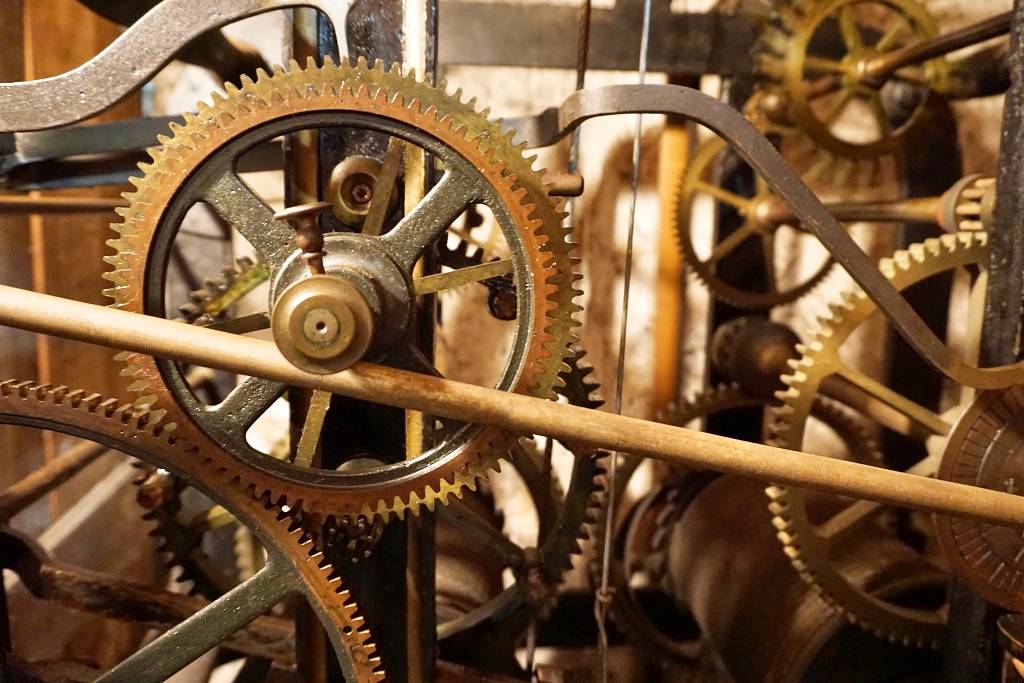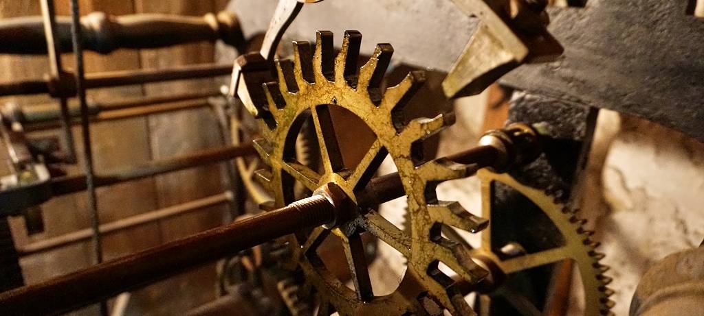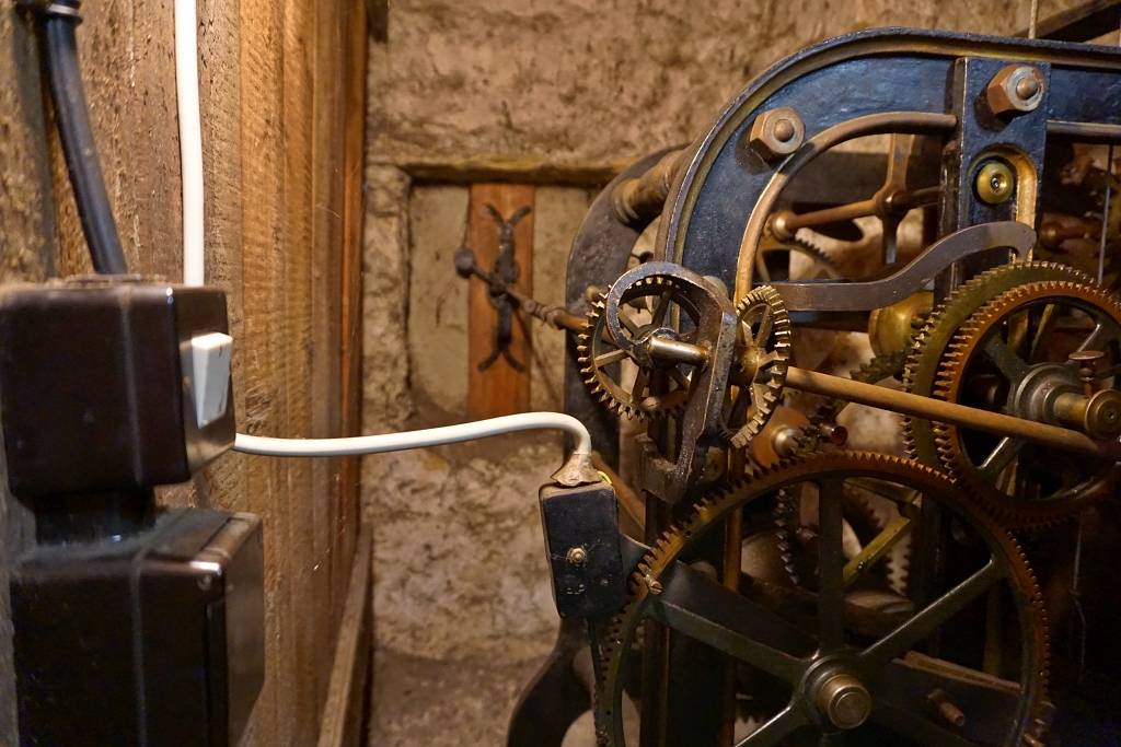 … ist Kristian Bockermann. Einmal in der Woche steigt er dutzende steile Treppenstufen bis in die Spitze des Turms der evangelischen Kirche hinauf. Dort oben unter den Glocken steht ein hölzerner Schrank. Darin ist Platz für die Uhr, Kristian Bockermann und seine Kurbel. Wie der Anker eines Schiffes wird mit der Kurbel das schwere Antriebsgewicht den ganzen Weg den Kirchturm hinauf an einem Drahtseil empor gezogen.
