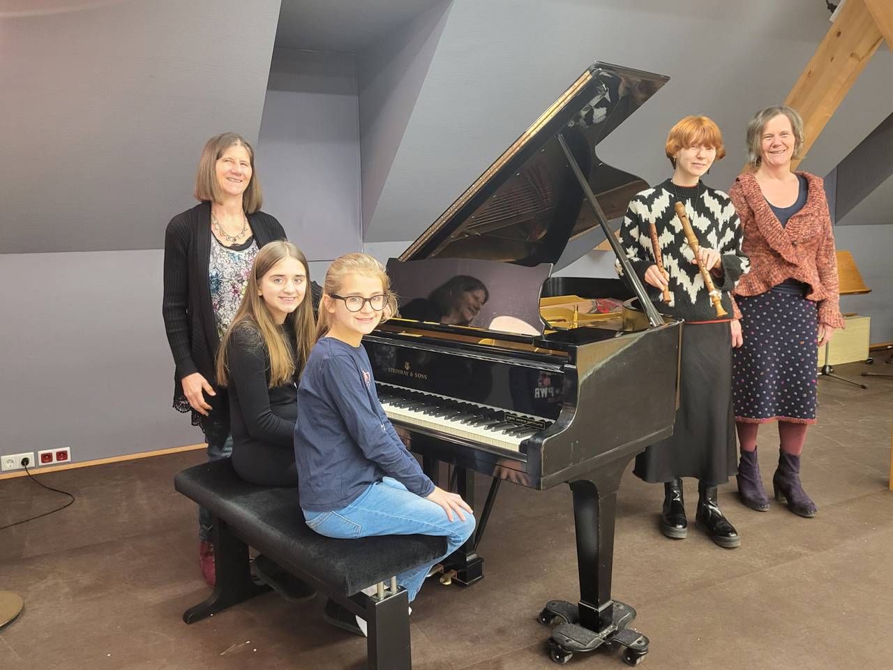 In diesem Jahr haben sich die Geschwister Lara und Nele Müller in der Kategorie „Klavier vierhändig“ mit 20 Punkten einen hervorragenden zweiten Preis erspielt. Besonders erfolgreich war Charlotte Menke im Wertungsbereich „Holzblasinstrumente“. Für ihr Musizieren auf der Blockflöte bekam sie von der fachkundigen Jury 24 Punkte (von 25 möglichen) zugesprochen und qualifizierte sich dadurch mit einem ersten Preis für den Landeswettbewerb, der in diesem Jahr im März in Köln stattfinden wird. Mit den Preisträgerinnen freuen sich die beiden erfolgreichen Musiklehrerinnen Martina Busemann und Antje Heinemann.