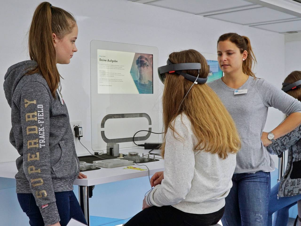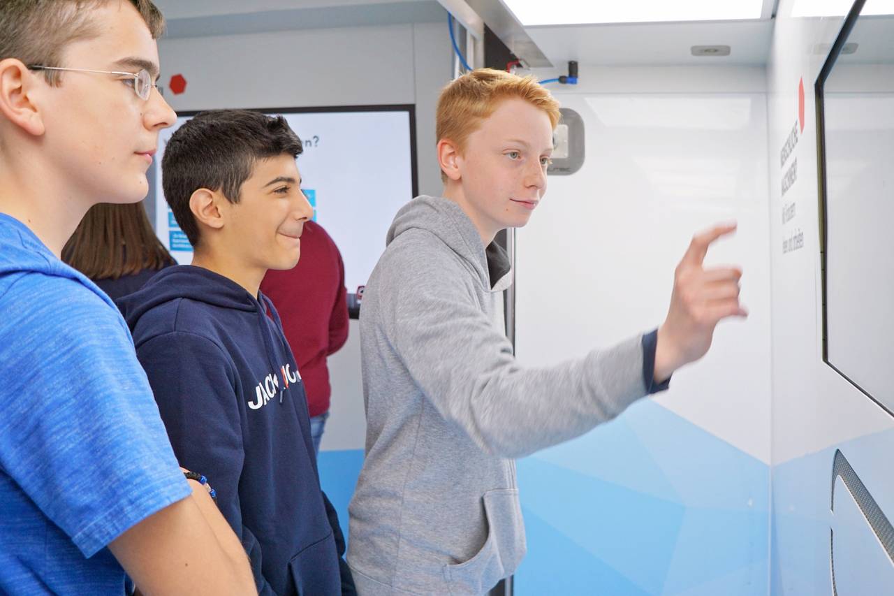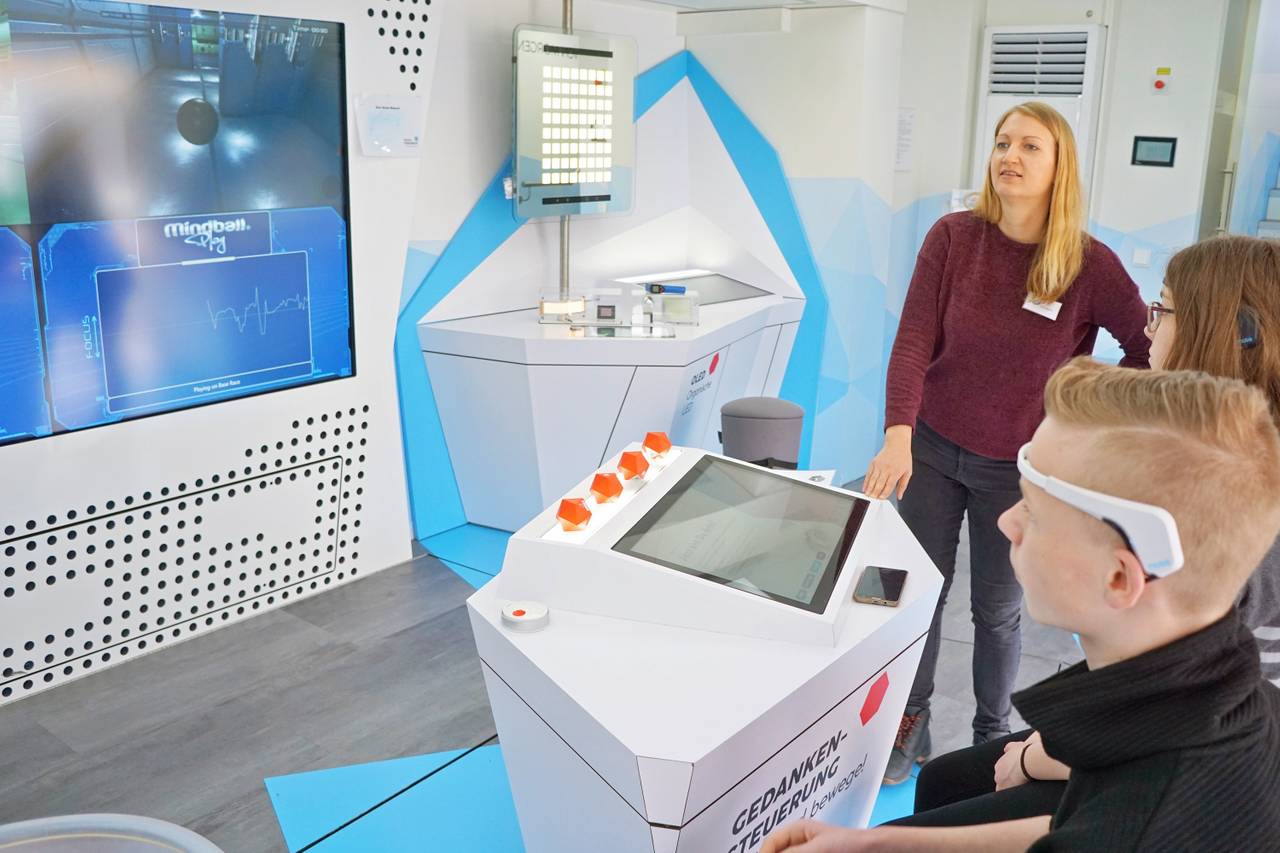 Einen Ball mit Gedankenkraft durch eine Hindernisstrecke steuern, einem Roboter beibringen, Kuscheltiere zu apportieren oder einfach nur einen Motor zusammensetzen, während die Anweisungen dazu sichtbar durch die Luft fliegen: das geht im TouchTomorrow-Truck an den Walburgisschulen in Menden. Was den meisten Lehrern vielleicht heute noch wie Zukunftsmusik erscheint, ist für die vielen Schüler bald Gegenwart. Und darauf wollen die MINT-freundlichen Walburgisschulen ihre Schüler vorbereiten. MINT - also Mathematik, Informatik, Naturwissenschaft und Technik steht da sowieso sehr im Mittelpunkt des Unterrichts. Bis zum 13. Mai wird der Truck noch auf dem Schulhof stehen.