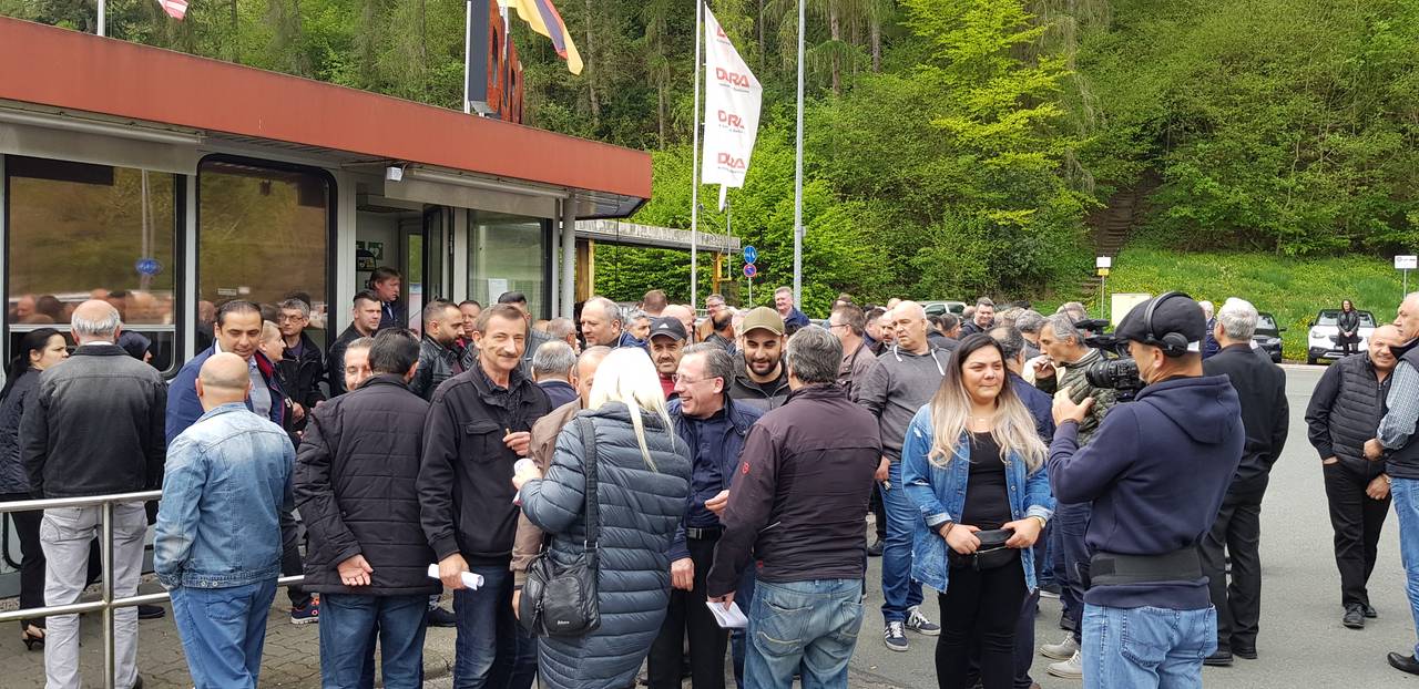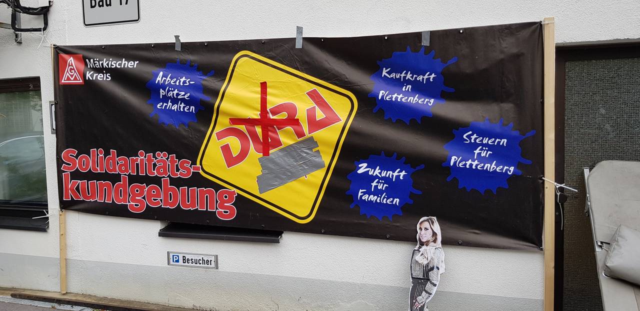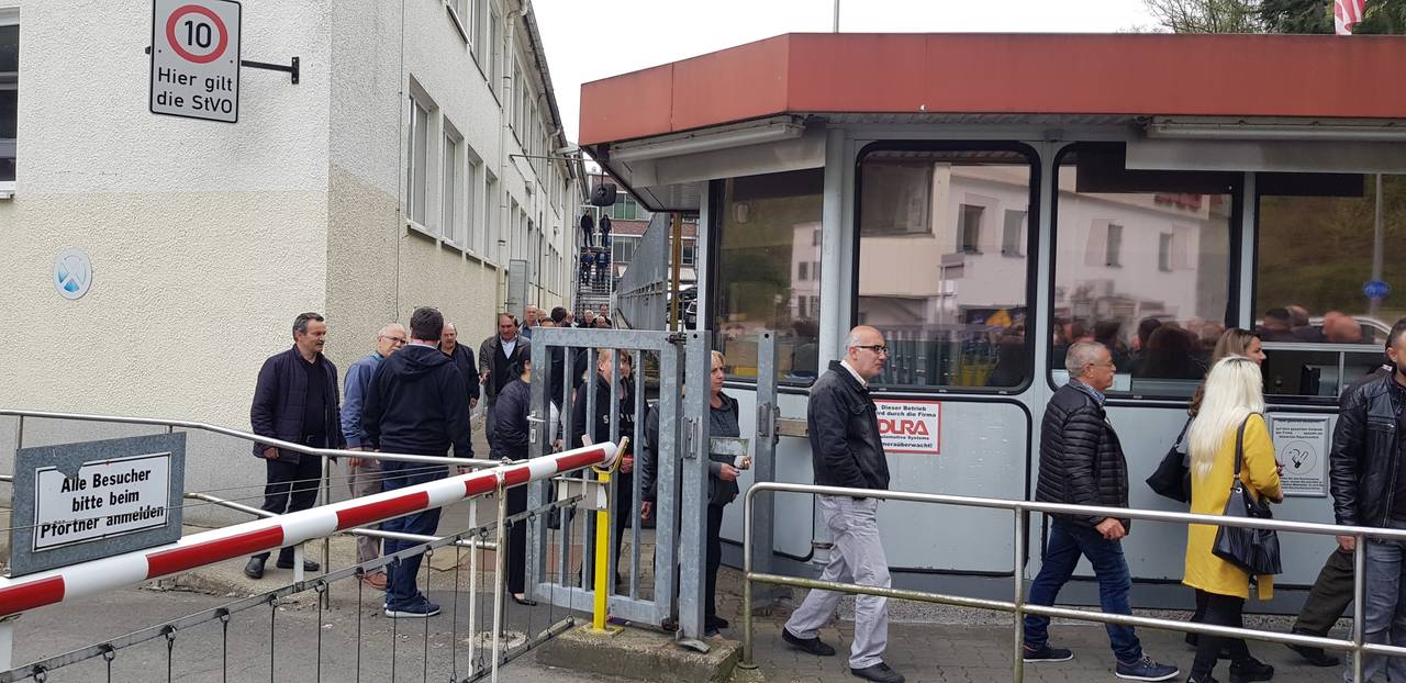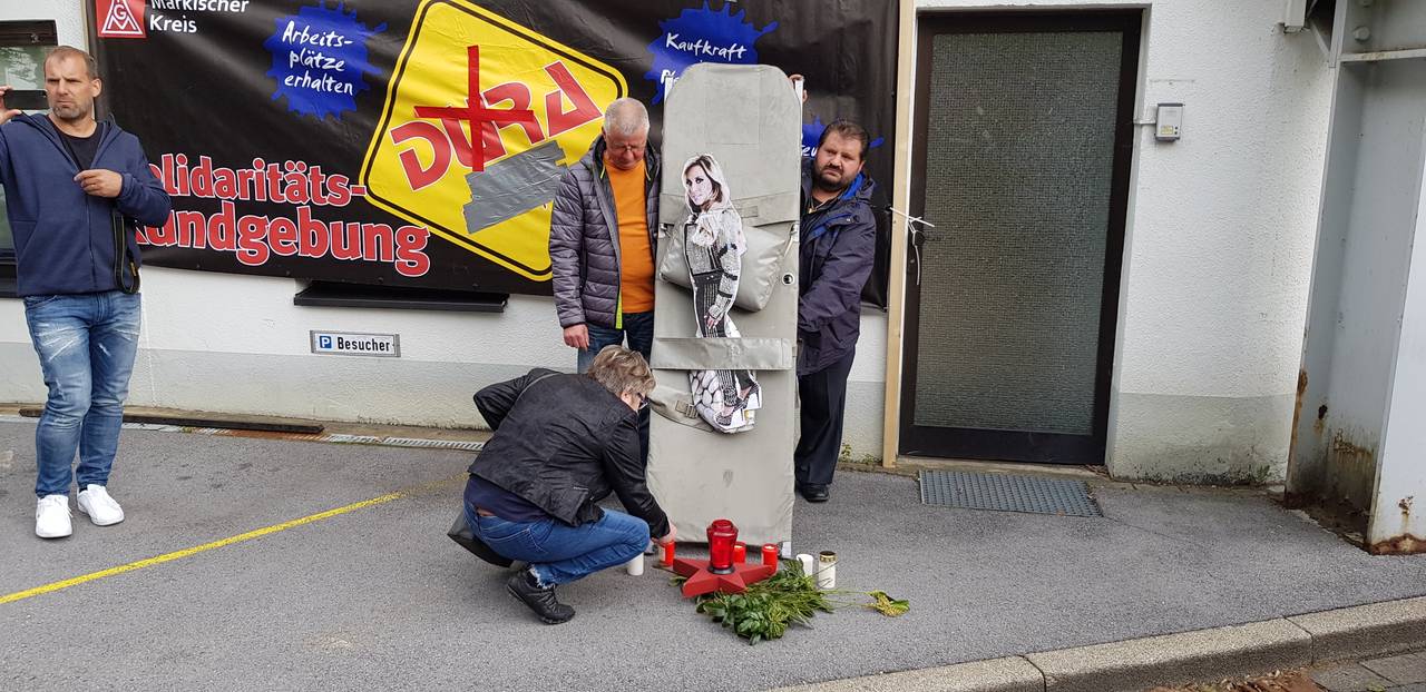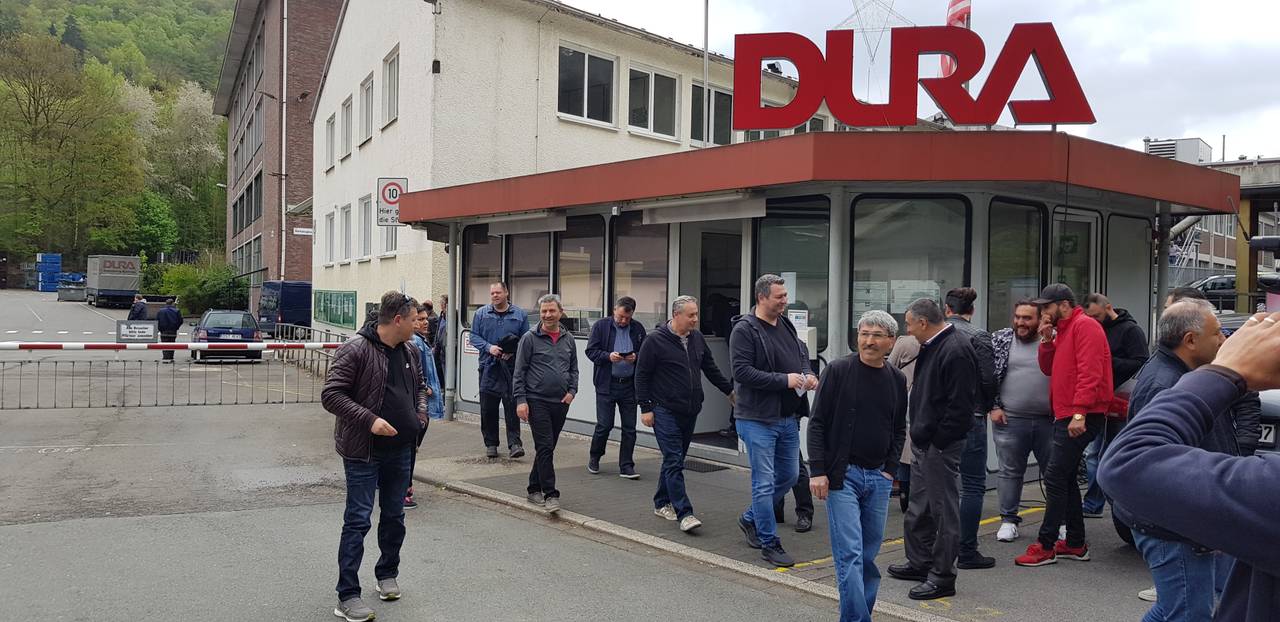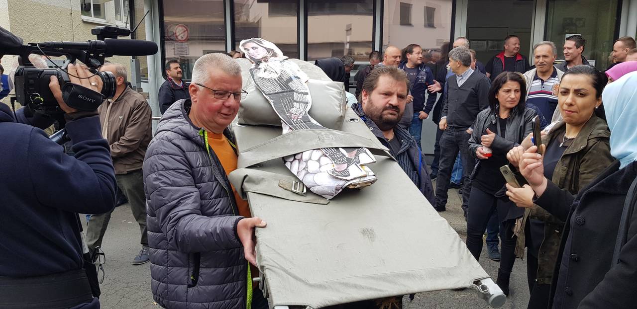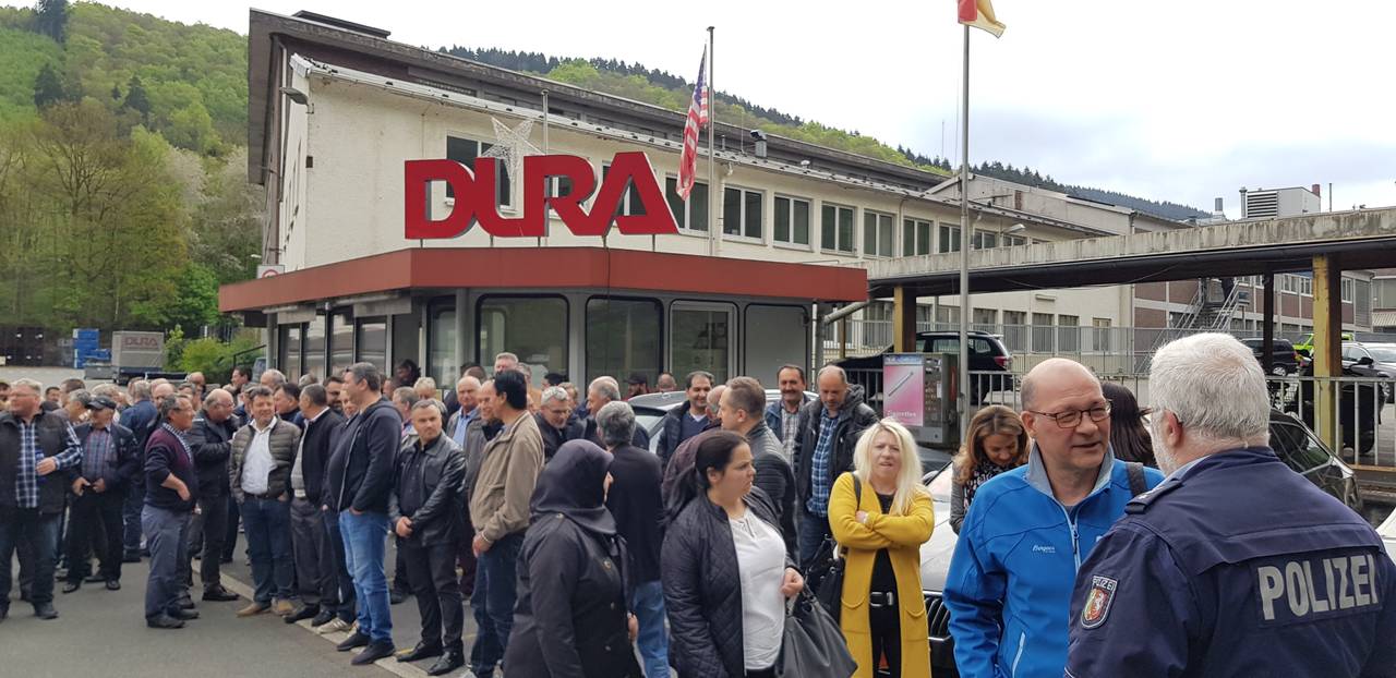 Rund 150 ehemalige DURA-Mitarbeiter haben vor dem Werkstor symbolisch ihre Firma zu Grabe getragen. Ab dem 30. April werden alle Kündigungen wirksam, insgesamt verlieren mehr als 900 Menschen ihren Job bei dem Automobilzulieferer. Die amerikanischen Investorin hatte den Zweig der Firma aus wirtschaftlichen Gründen geschlossen. Auch sie wurde in Form einer Pappfigur auf eine Bahre aus dem Werk getragen.