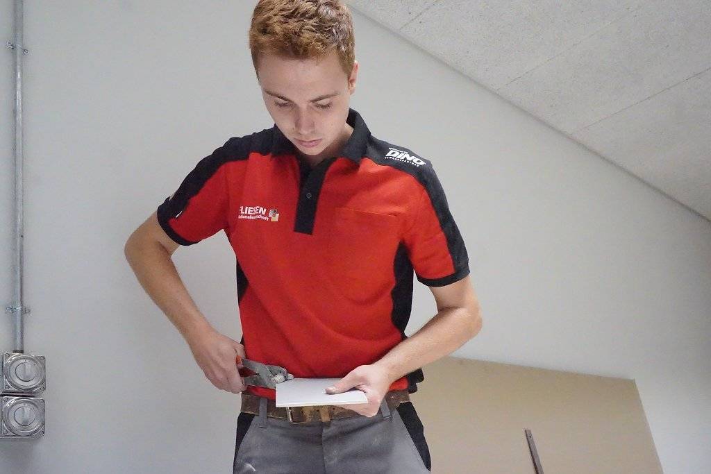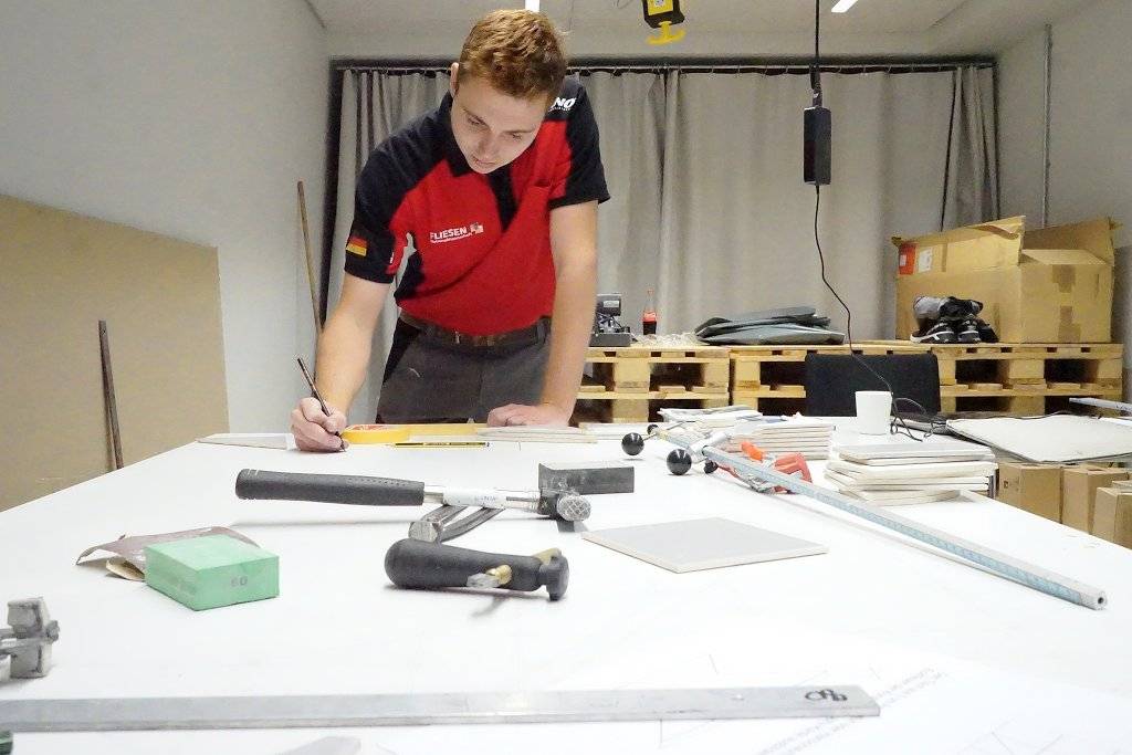 Die Fliesen-Nationalmannschaft trainiert bei uns in Iserlohn-Letmathe. Und zwar für die Weltmeisterschaft im November im italienischen Südtirol. Trainingslager ist dabei die Firma Blanke Systems. Im Bild - sozusagen der Stürmer der Mannschaft: Yannic Schlachter (23) aus Albbruck im Süd-Schwarzwald. Er ist auch amtierender Europameister. Ebenfalls mit dabei: Bundestrainer Marcel Beyer.