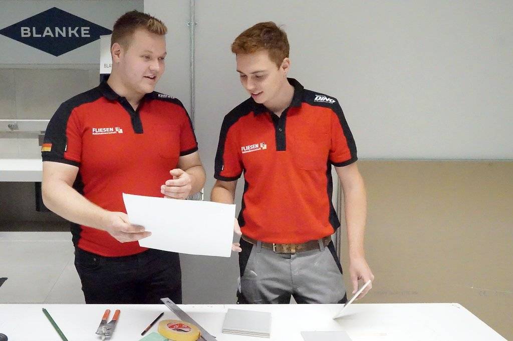 Yannic Schlachter (re.), Europameister im Fliesenlegen und sein Bundestrainer Marcel Beyer.