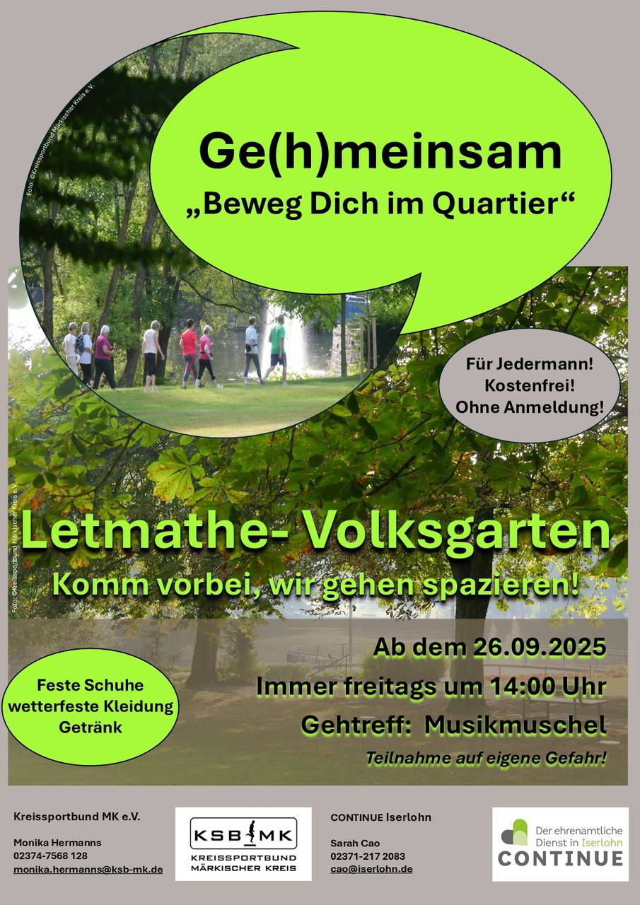 Bewegung verbindet und hält Geist und Seele fit. Genau das ist auch die Idee hinter dem neuen Projekt "Ge(h)meinsam - Beweg dich im Quartier", das unter anderem vom Kreissportbund des Märkischen Kreises und Continue, dem ehrenamtlichen Dienst in Iserlohn ins Leben gerufen wurde. Spazierfreudige treffen sich an vier verschiedenen Treffpunkten in Iserlohn, um gemeinsam eine schöne Runde zu drehen. Dabei gibts die Gelegenheit, neue Menschen kennenzulernen, sich ganz entspannt zu unterhalten und gemeinsam eine gute Zeit zu haben.