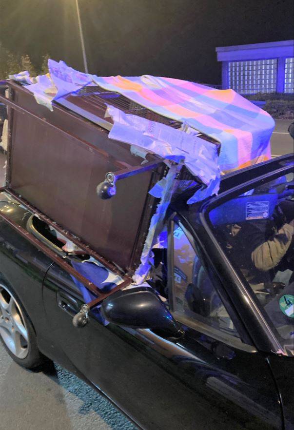 Da kauft ein Iserlohner Vogelfreund in Wuppertal vier Graupapageien samt Käfig [Anmerkung der Redaktion: Bei den Tieren handelt es sich nach Rückmeldungen von Hörern um Nymphensittiche, anstatt wie in der ursprünglichen Meldung um Graupapageien]. Der ist aber riesig groß: 1,50 x 1 x 0,5 Meter! Dazu kommt noch ein Untergestell mit Rollen (siehe Bild unten). Zu groß eigentlich für seinen kleinen Mazda Cabrio. Doch er probiert's und legt den Käfig quer ins offene Auto. Der ragt dann von der Frontscheibe bis zum Kofferraum. Für den Fahrer bleibt kaum Platz. Und der Käfig ist nicht befestigt - der 61-Jährige hält ihn mit den Vögeln während der Fahrt mit einer Hand fest!