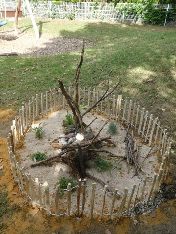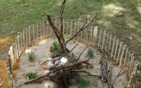 Das Winterquartier für Eidechsen ist ein knapp 50 Zentimeter tiefes Loch in der Erde. Dieses wird mit großen Steinen gefüllt, oben ragen dann noch Äste aus den Steinen. Hier können sich die Eidechsen im Winter sicher verstecken, wenn die Winterstarre bevorsteht. Außerhalb des Loches wird Sand aufgeschüttet. Bei Sonne können sich die Tiere hier dann aufwärmen. Die Steine und Äste haben die Kinder in den Tagen vor dem Projekttag selbst gesammelt. Ein Zaun schützt später die Burg vor unerwünschten Besuchern.