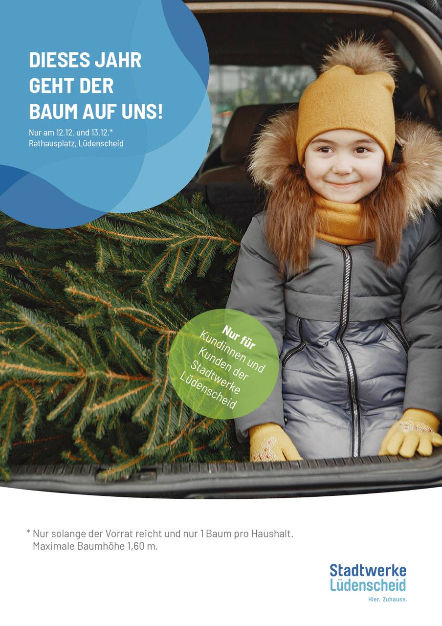 Wer seinen Ausweis und eine aktuelle Rechnung vorlegen kann, bekommt am 12. und 13. Dezember seine Fichte auf dem Rathausplatz. Laut Stadtwerke soll das ein kleiner Beitrag zur Entlastung der privaten Haushaltskassen in Lüdenscheid sein. Die Weihnachtsbäume sind rund 1,60 Meter groß. Die Menge ist begrenzt - Bäume gibts nur, solange der Vorrat reicht.