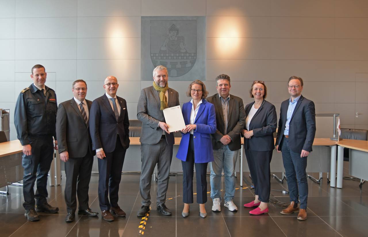 Feuerwehrchef Christopher Rehnert, Fabian Kesseler (1. Beigeordneter), Ralf Schwarzkopf (MdL), Bürgermeister Sebastian Wagemeyer, Ministerin Ina Scharrenbach, Gordan Dudas (MdL), Angela Freimuth (MdL) und Stadtkämmerer Sven Haarahaus.