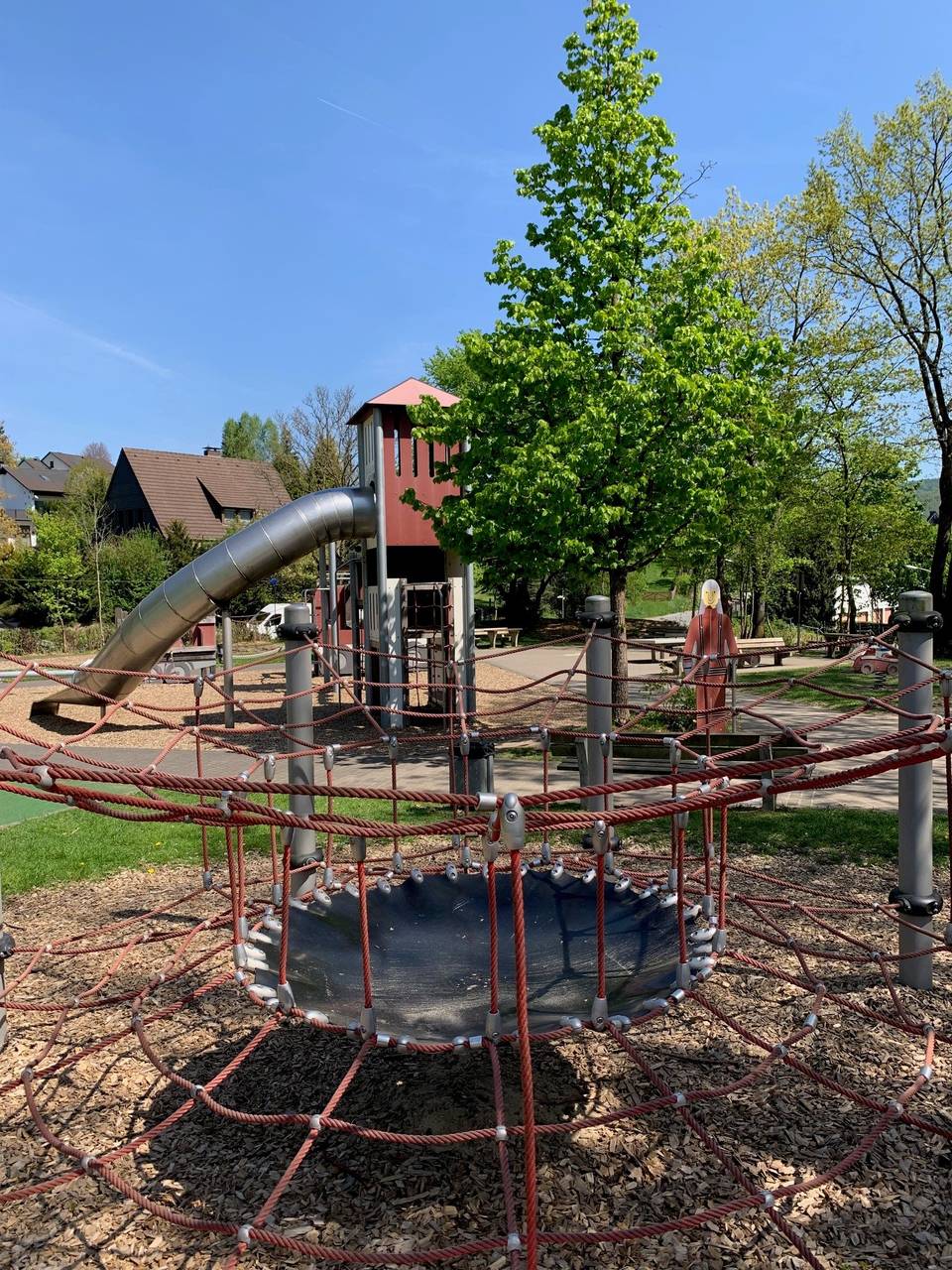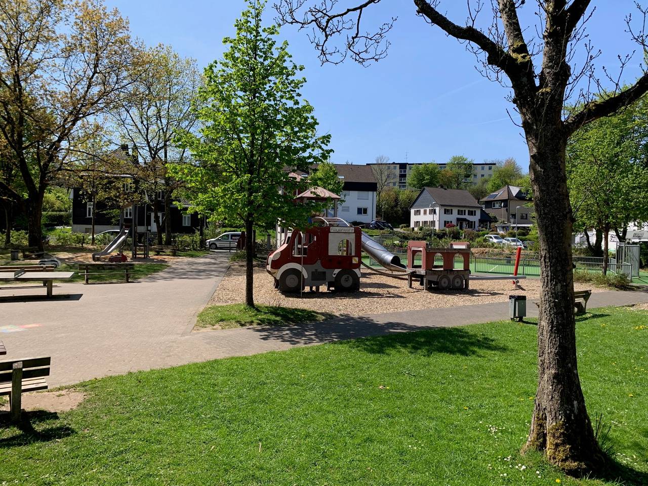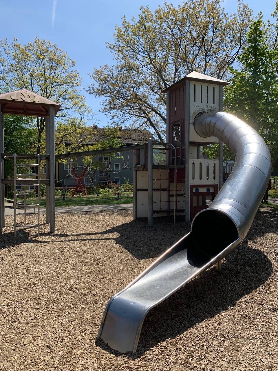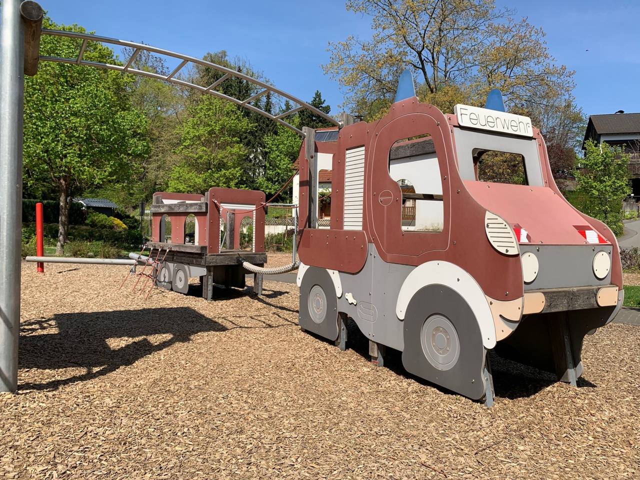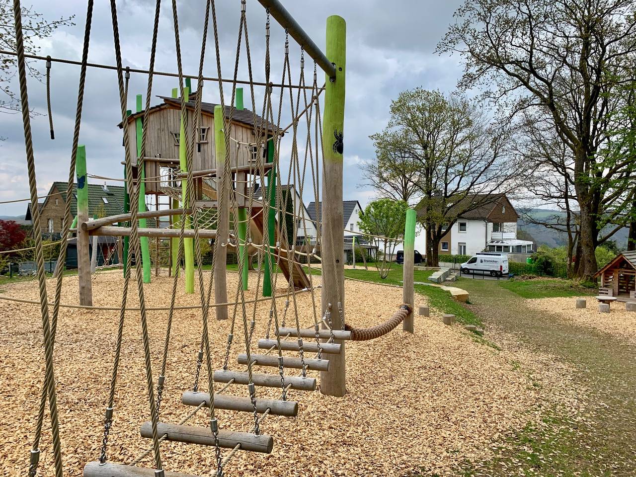 Oben auf der Hechmecke, zwischen Bäumen und mitten im Wohngebiet liegt der beste Spielplatz im Märkischen Kreis. Es gibt einen kleinen Kletterpark im Feuerwehrstil, ein grünes Fußballfeld mit Kunstrasen, eine Nestschaukel, ein Sprungtuch und eine Seilbahn. Natürlich auch jede Menge Sand. Die Kinder aus der Hechmecke und Holthausen konnten sich vorher wünschen, was sie alles gerne hätten und so wurde zum Beispiel auch das Fußballfeld mit Kunstrasen gebaut. Die Stadt Plettenberg versucht, jeden Spielplatz anders zu gestalten. Der Spielplatz sieht mit seinen Türmen und Feuerwehrautos aus Holz in der Kletteranlage nicht nur aus wie eine Feuerwache. Es ist auch so, dass die Löschgruppe Holthausen die Patenschaft des Spielplatzes übernommen hat. (FrK) © Bilder: Frank Köhler (Radio MK)