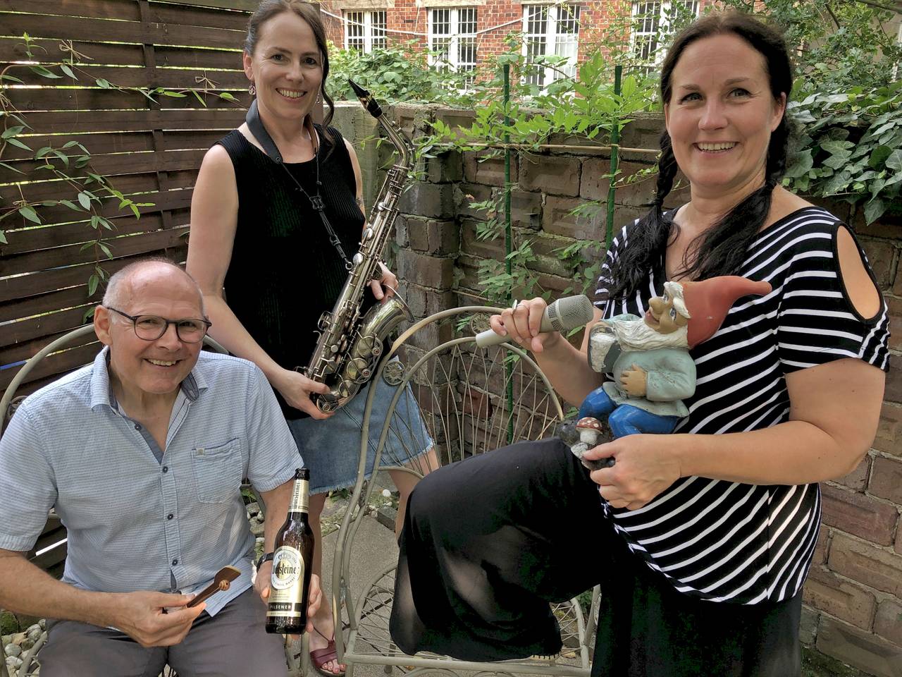Aber Sängerin Sonja aus Menden und das Duo "Pepper & Swing" mit Dorothee und Peter, die haben die (leere) Warsteiner-Flasche nicht nur wegen dieser Strophe mit in die "Band" genommen, sondern als Rythmus-Instrument. So als Schlagzeug-Ersatz... Und damit war ihr Beitrag für unseren Sauerland-Cover-Wettbewerb komplett. Die Sauerländische Lösung eben! Und der Gartenzwerg? Nun...