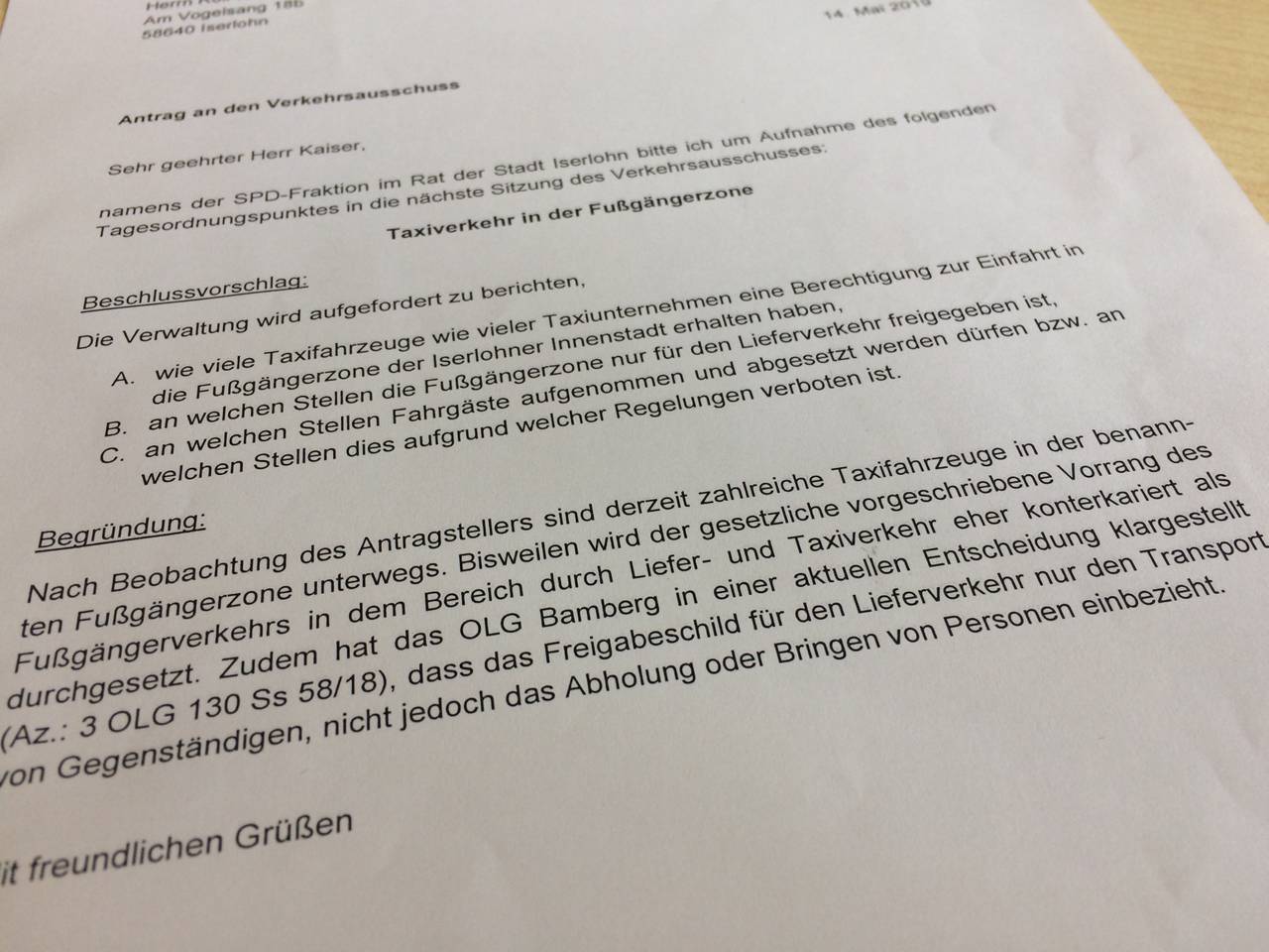 Oft sind es Taxen, die dort unterwegs sind. Die Iserlohner SPD fordert die Stadtverwaltung auf, dazu Stellung zu nehmen. Sie bezieht sich dabei auch auf ein Urteil aus Bamberg: Danach erlaubt das Freigabeschild für den Lieferverkehr nur den Transport von Gegenständen - nicht aber das Abholen oder Bringen von Personen in der Fußgängerzone.