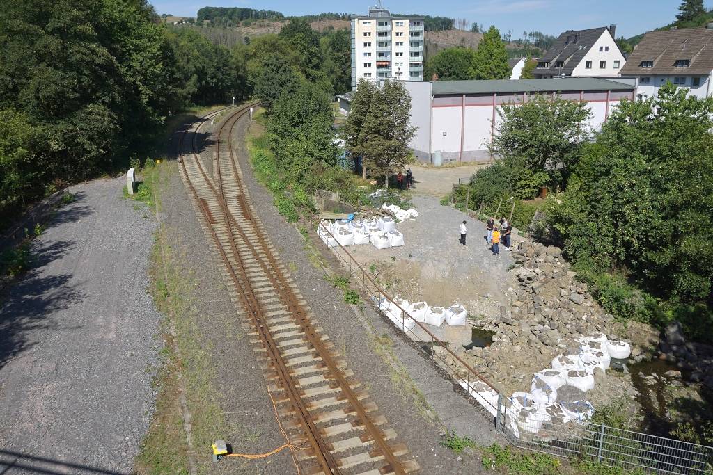 Der Bahndamm wird bis Ende des Jahres fertig sein, dann fahren Züge von Hagen wieder bis Schalksmühle und Dahlerbrück. Die Eisenbahnbrücke vor Lüdenscheid-Brügge bleibt aber gesperrt. Der Mittelpfeiler ist teilweise vom Wasser unterspült. Die Bahn prüft jetzt drei Varianten, die Brücke wieder für Züge befahrbar zu machen. Eine Reparatur des Pfeilers oder zwei verschiedene Arten einer Hilfsbrücke. Jede Variante hat ihre eigenen Probleme, die erst alle geprüft werden müssen. Ende des Jahres soll es aber ein Ergebnis geben.
